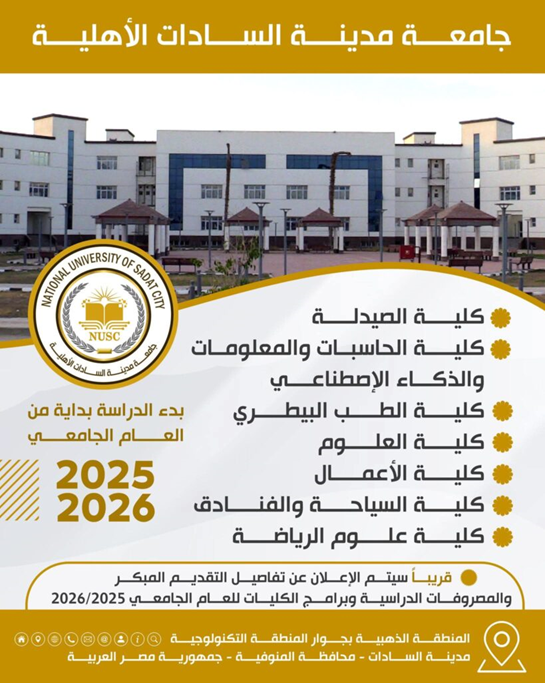 إذا كنت مهتمًا بتخصصات مبتكرة وحديثة مثل الذكاء الاصطناعي أو السياحة والفنادق، وتبحث عن جامعة أهلية داخل مصر توفر بيئة تعليمية متطورة وعصرية، فقد تكون جامعة مدينة السادات الأهلية خيارًا جيدًا لعدة أسباب: